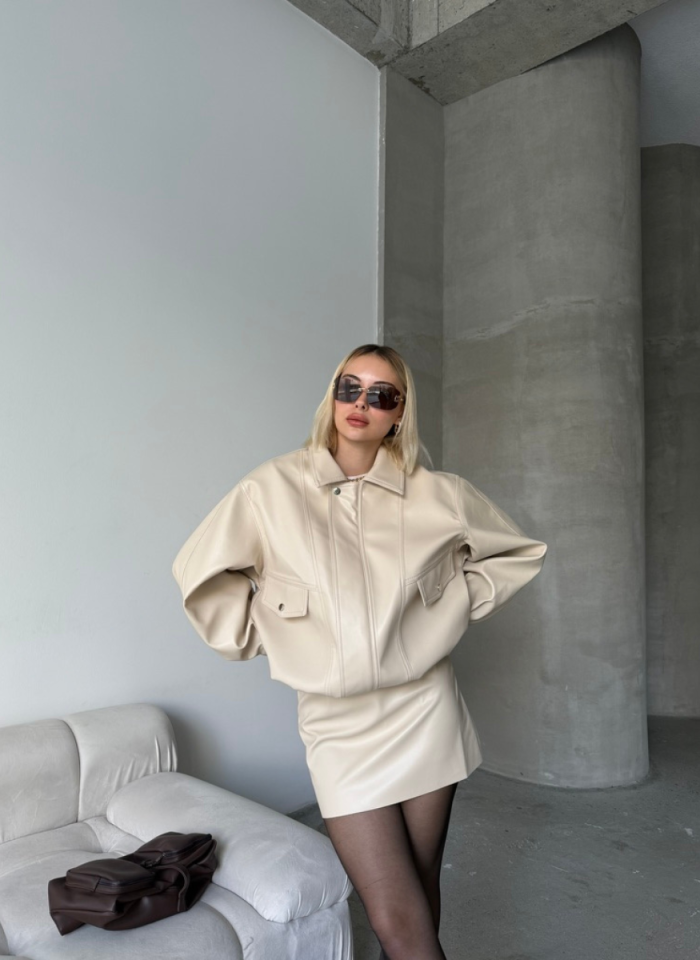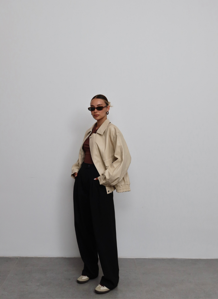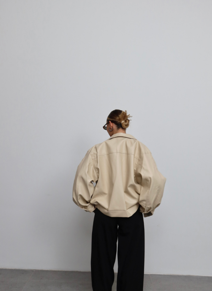 Bisiklet yaka, gizli fermuar, yanları lastikli suni deri ceket